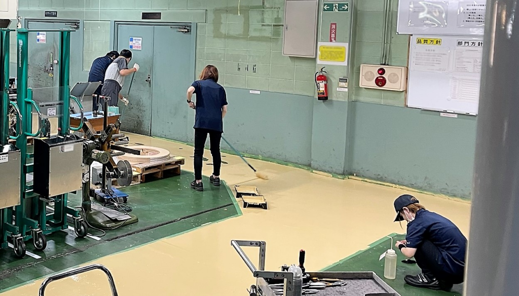 毎年当社ではお盆休みに入る前にプレス工場床のペンキ塗りを自分たちで行います。と言うか自主的に行ってくれます。