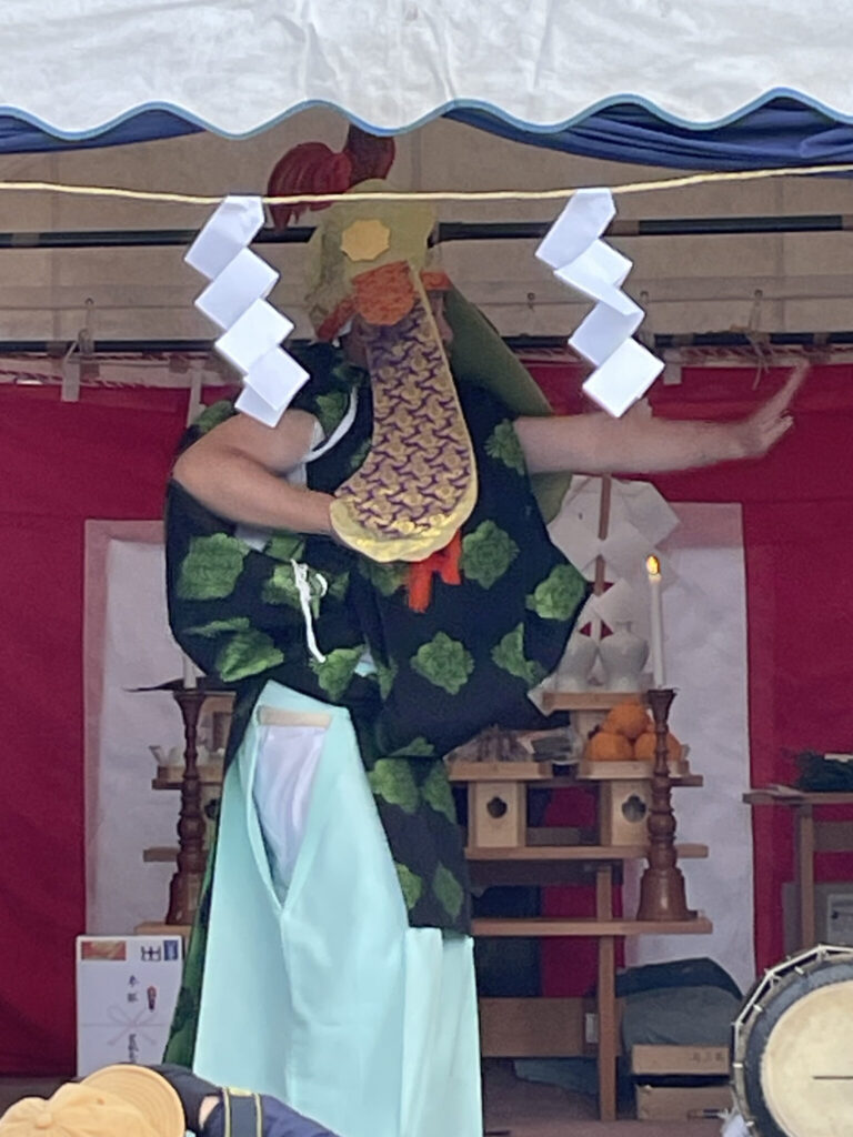 諏訪神社に特設テントを設け、神官が商売繁盛や五穀豊穣を祈願して様々な舞を奉納します。舞には〈五調子〉と呼ばれるものや〈榊舞〉と呼ばれるものがありますが、なかでも最後の〈鳥子舞〉は、神官が鳥の形をした冠をつけて衣装にたすき掛けをして舞われるもので、奉納される舞のなかでは多くの注目を集める代表的な舞となっております。