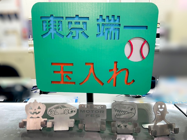 景品として社内でレーザー加工したステンレスをその場でハンドプレスをしてもらい、