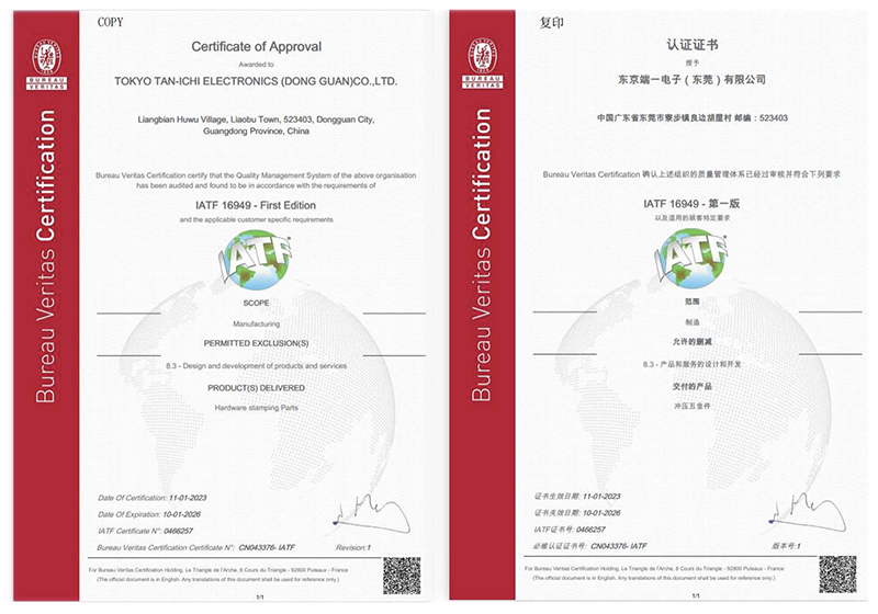 中国工厂位于广东省东莞市寮步镇,拥有45t~160t的冲压设备50台,主要生产精密卷带端子及精密五金零件。