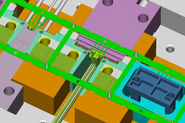 フープインサート成形とは、当社で製造したプレス部品を連続した状態(フープ状)で巻き取り、成形金型に自動投入して、そこへ溶融樹脂を射出することで、金属部品と樹脂部品が一体化された成形品を自動かつ連続的に量産する技術です。